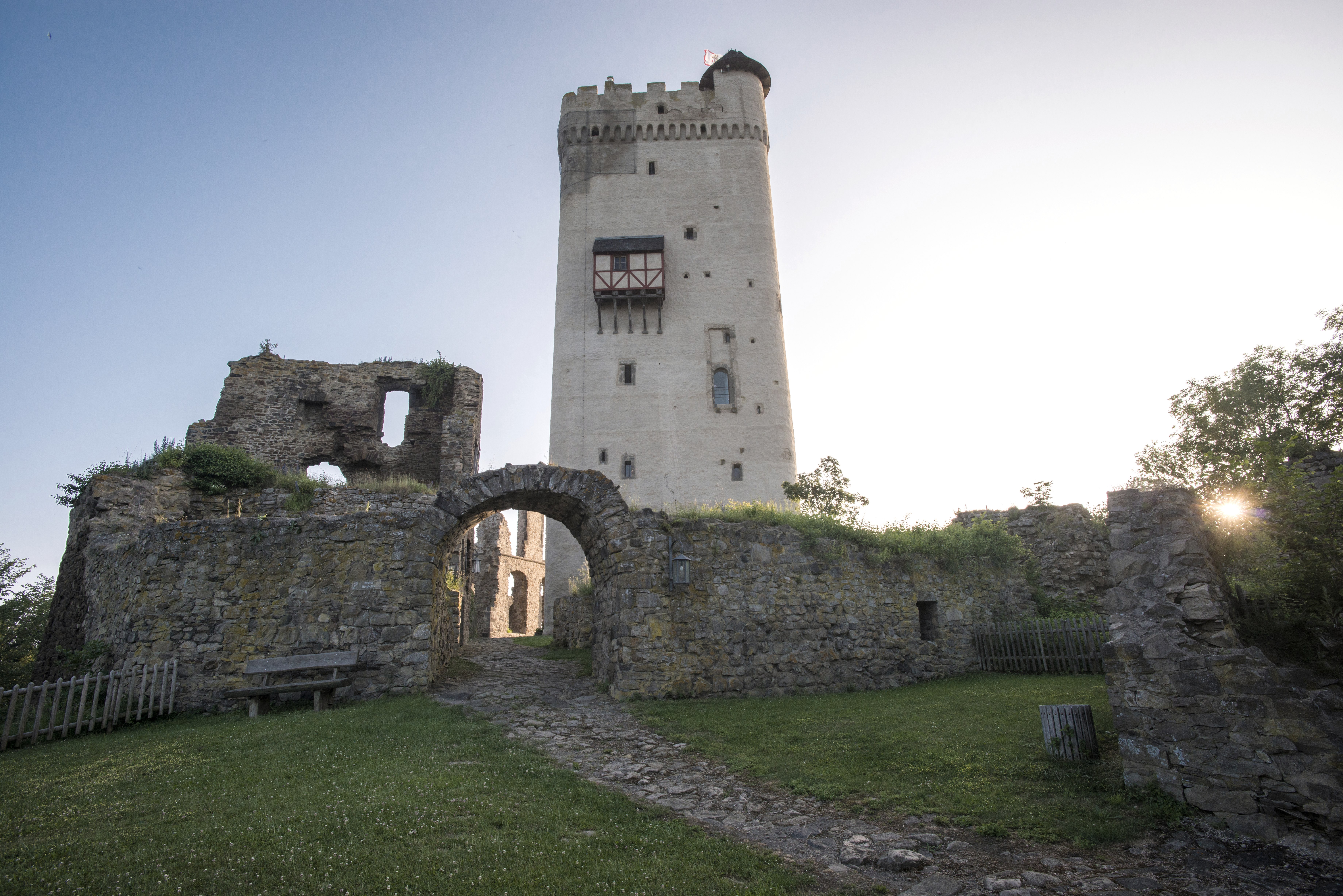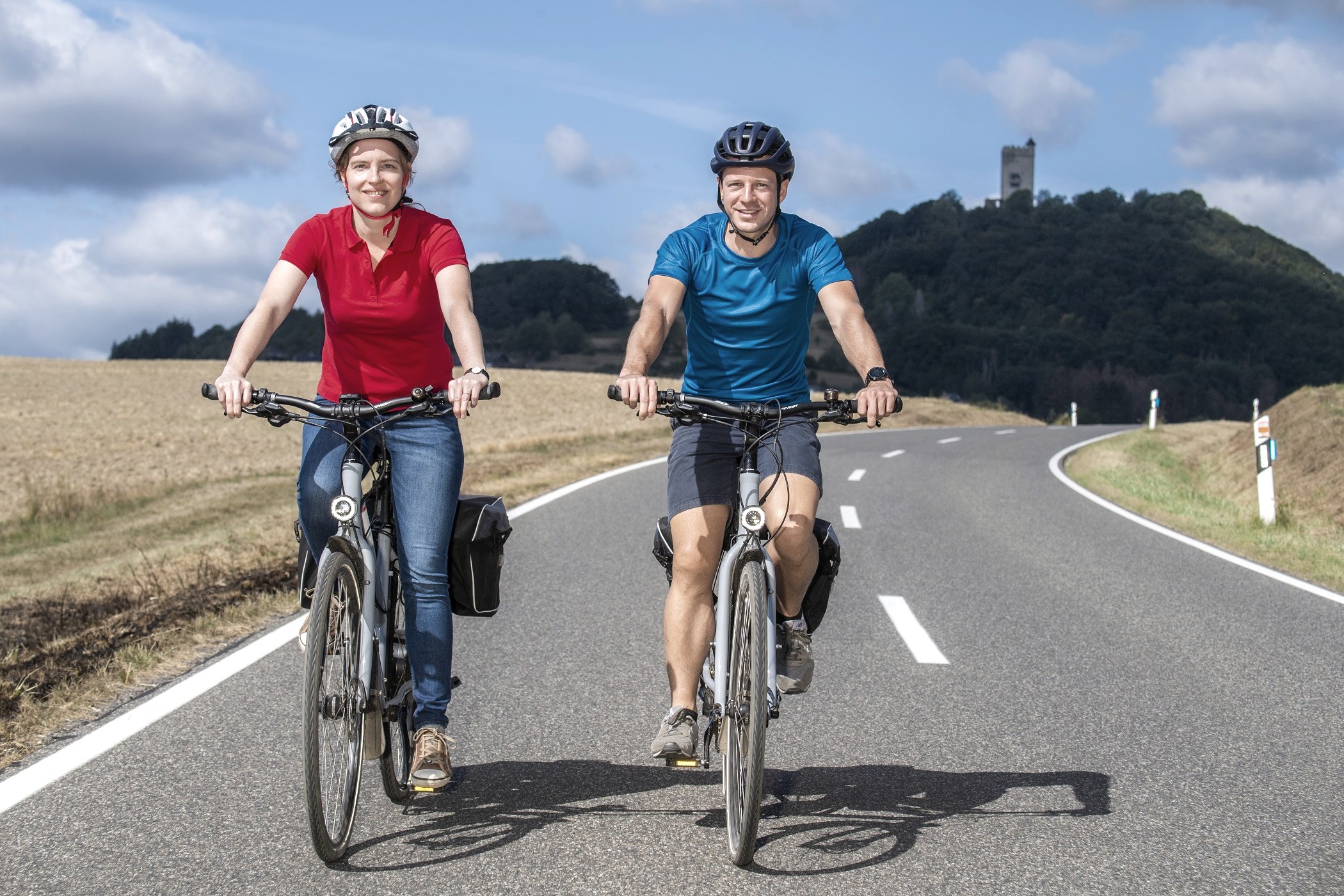 Bell. Dabei wird die A61 unterquert. In Bell fahren wir rechts hoch über den Teerweg zum Gänsehals (Steigung bis zu 16% ). An dieser Stelle sollten E-Bikes noch mindestens 30 % ihrer Akku-Ladung zur Verfügung haben. Nicht ganz bis oben hin (es sei denn, man will den Turm bis zur Aussichtsplattform besteigen – lohnt sich !). Vor dem finalen Anstieg geht es links ab von der Teerstraße in einen Feldweg (vielleicht wird der in der nächsten Zeit etwas besser befestigt). Abfahrt in Richtung Rieden – zunächst Feld- und Waldweg, dann geteerter Wirtschaftsweg. Bis zur Kreisstraße. Diese wird überquert um dem geteerten Wirtschaftsweg bis zum Windpark Rieden / Weibern zu folgen. Oben angekommen biegen wir links, späterrechts ab und nehmen die geteerte Abfahrt um in der Kirchstraße in Weibern anzukommen. Durch die Ortsstraßen fahren wir zum Ausgangspunkt zurück. Nach Abschluss der Tour bieten sich das örtl. Museum (Steinmetzbahnhof) sowie die kath.Pfarrkirche zur Besichtigung an. Ebenso lädt die örtl. Gastronomie zu Rast und Einkehr ein.