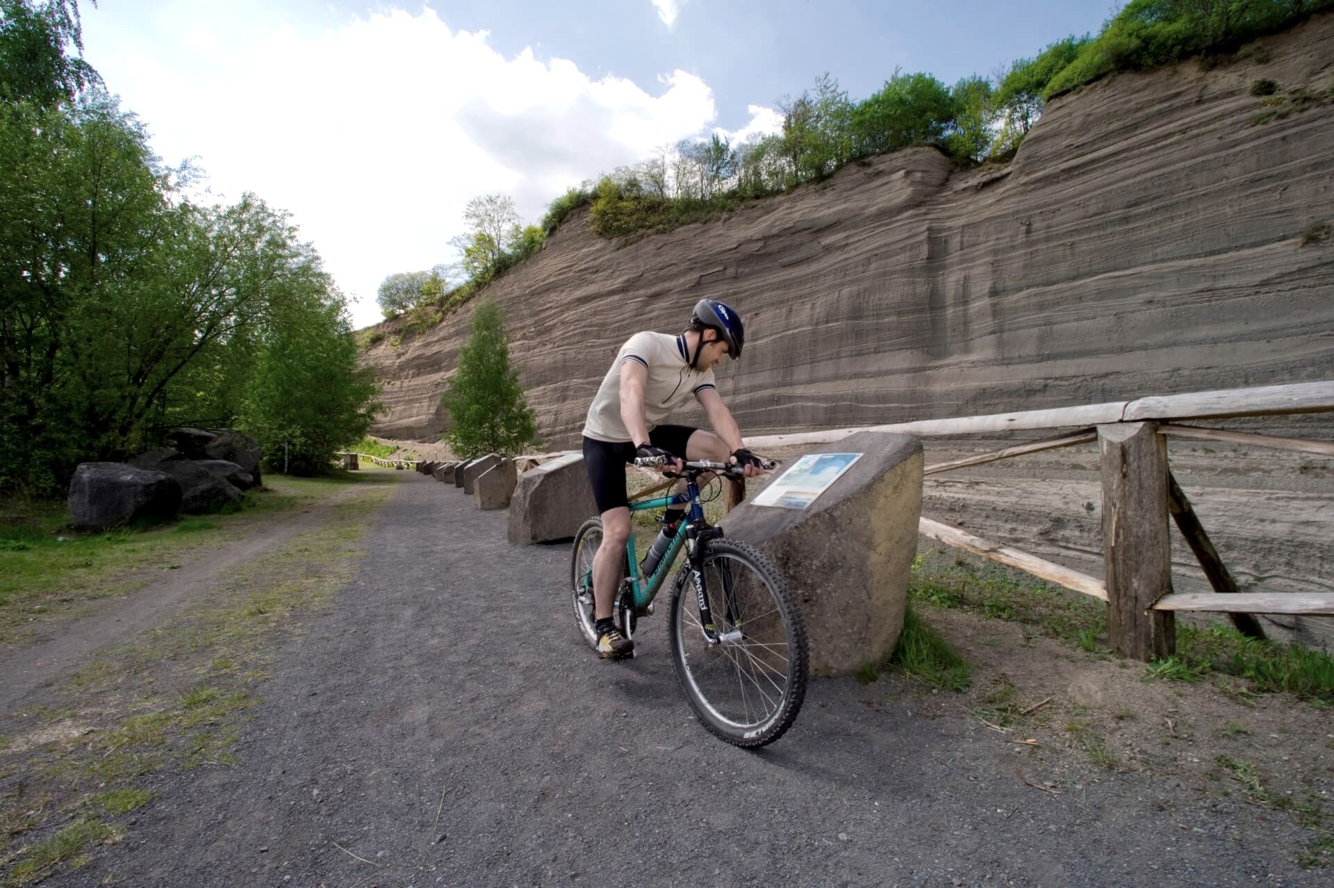 Glücklich machen sich die beiden auf den Weg. Schließlich stehen sie vorder beeindruckenden Wingertsbergwand und bestaunen die verschiedenen Ablagerungsschichten. Auf bebilderten Schautafeln lernen sie Erstaunliches über die Eruption des Laacher-See-Vulkans. Hoch über der bis zu 40 Meter hohen Wand kreist ein Uhu, der die beiden schnell entdeckt. „Was treibt ihr hier?“, will der Vogel wissen. „Wir wollen herausfinden, warum ich schwimmen kann“, antwortet Laachus. „Du kannst dich freuen“, so der kluge Uhu, „du wirst dein Rätsel schon sehr bald lösen – im Lava-Dome in Mendig.“ Nervös und aufgeregt machen sich Laachus und Basalthasar auf die nächste Etappe ihrer Reise.