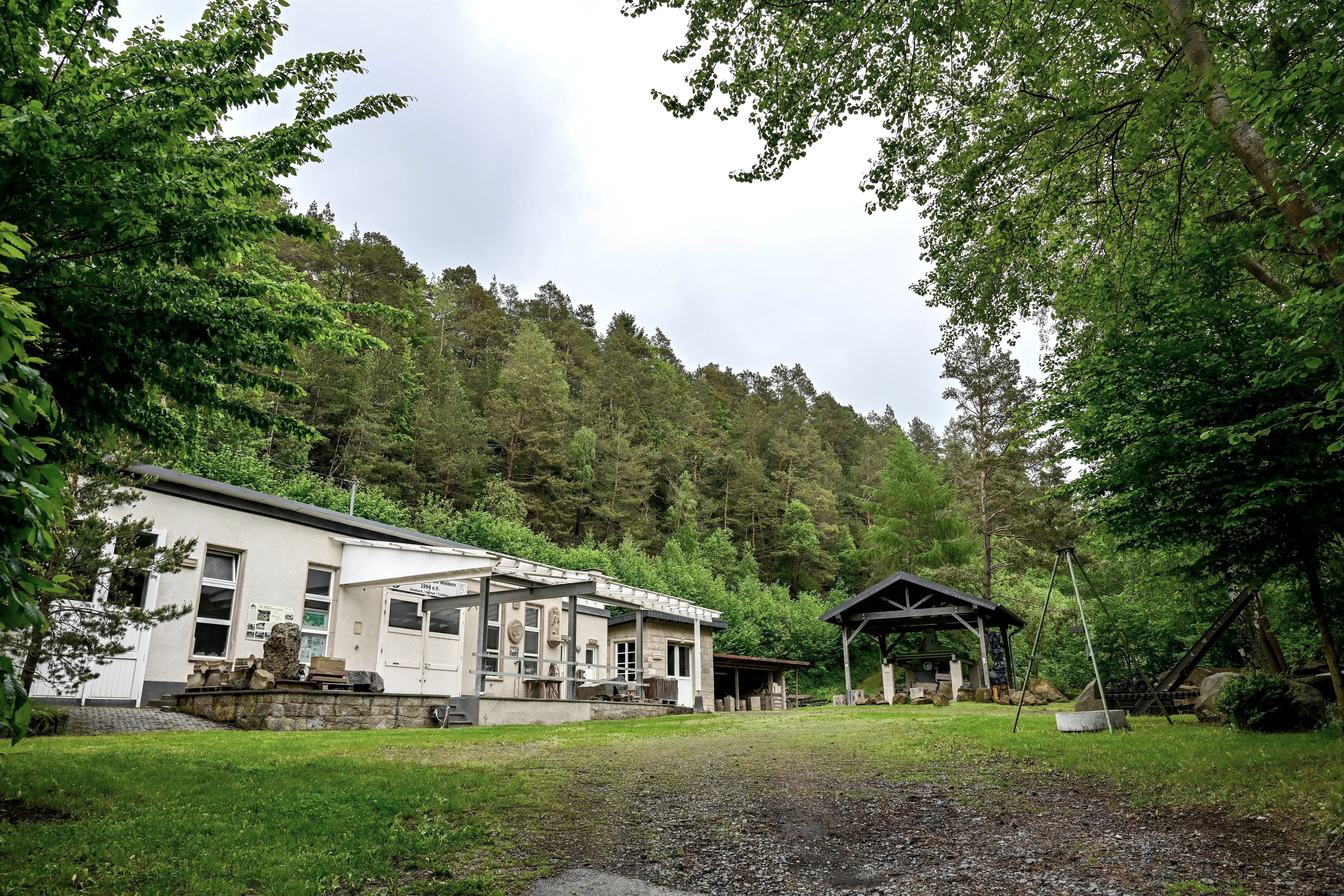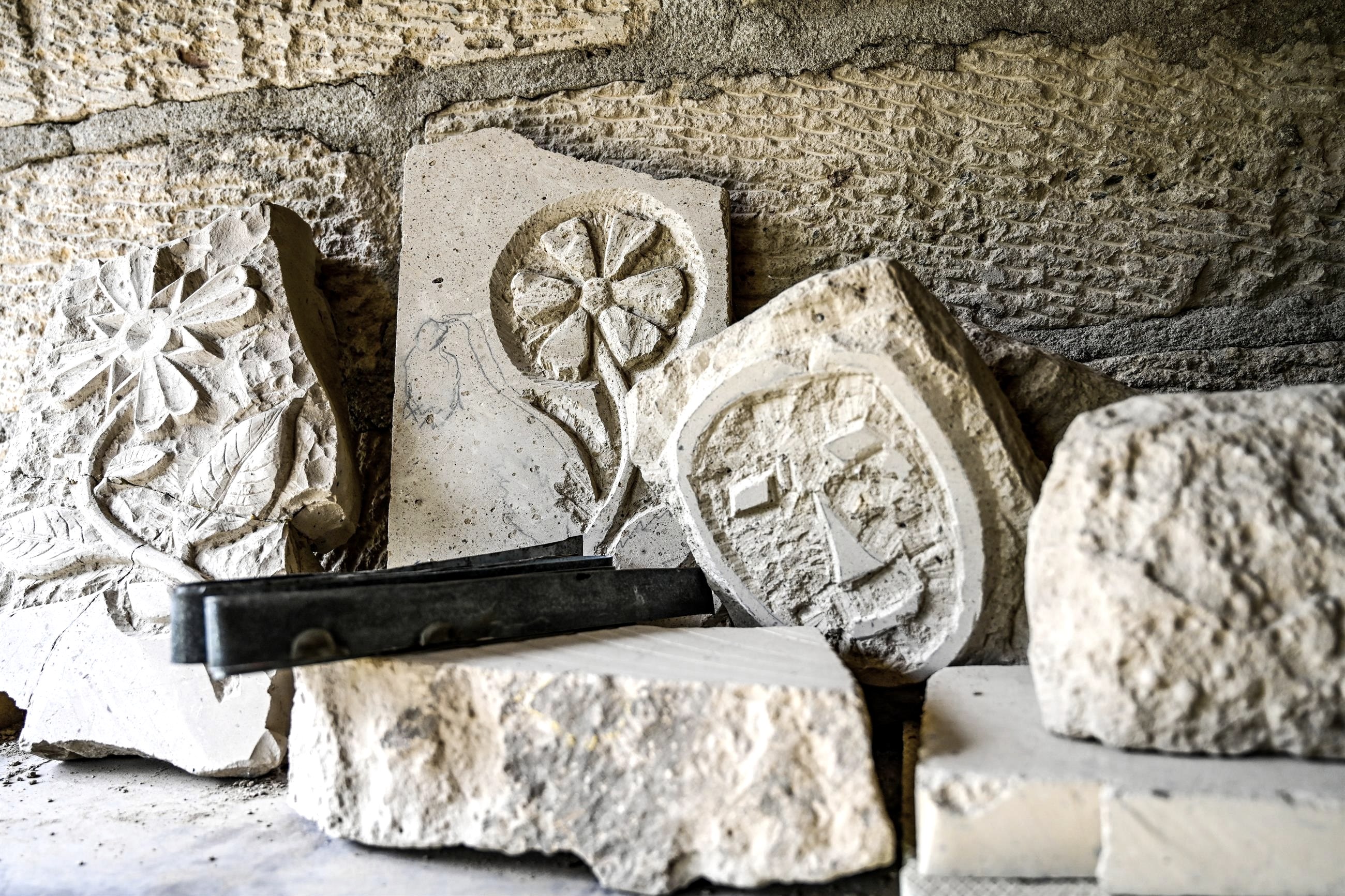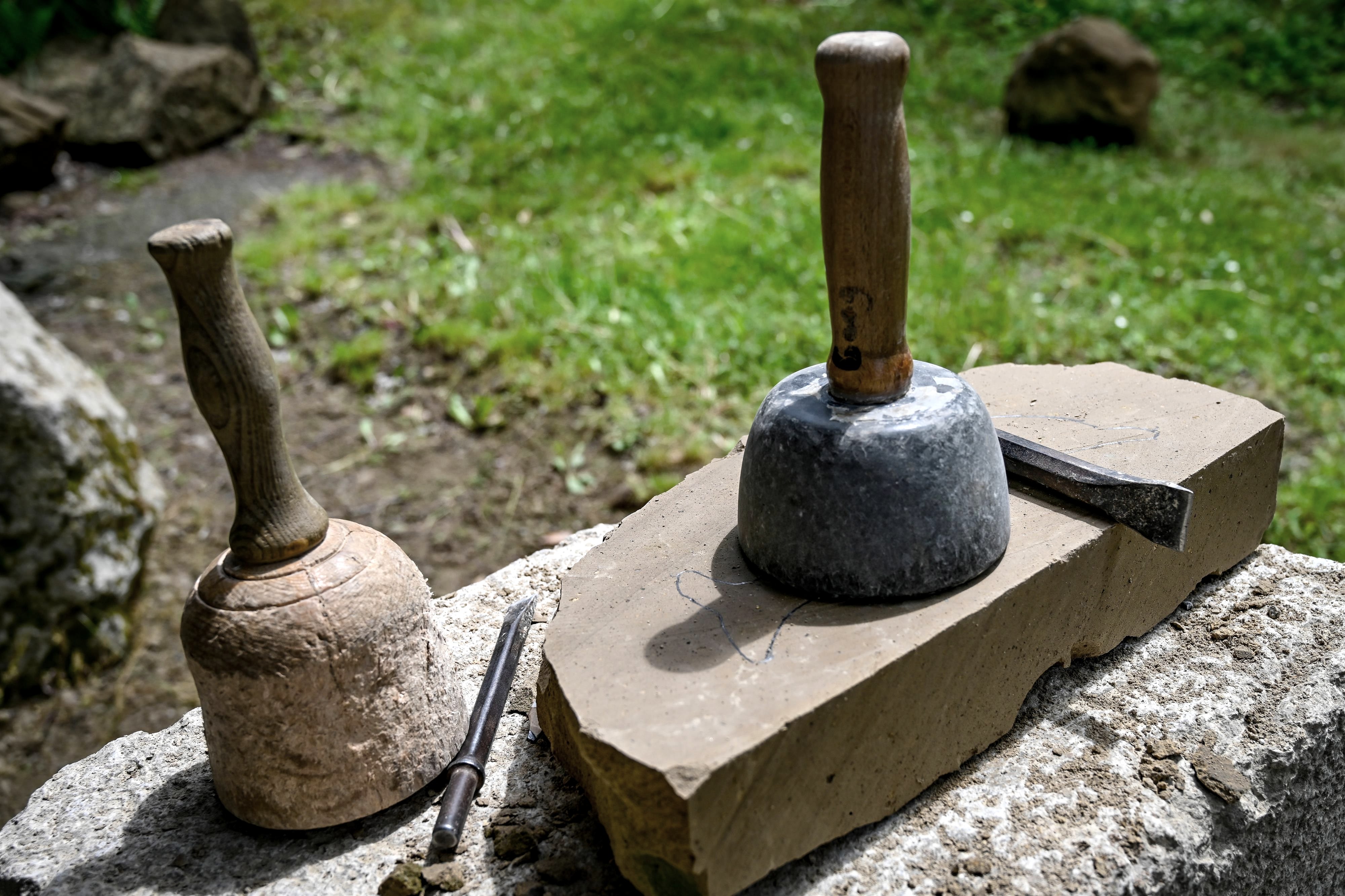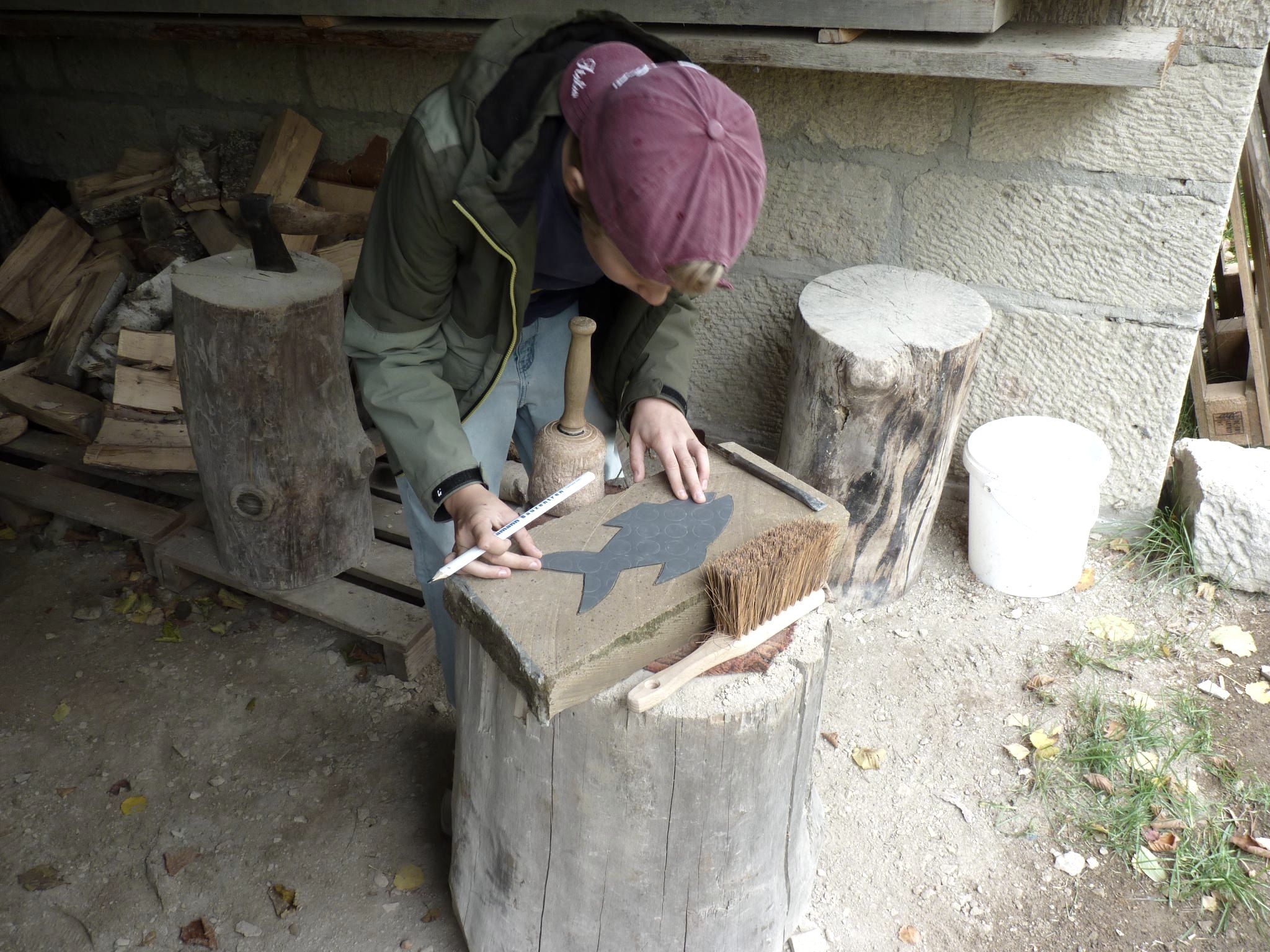 Im Tuffsteinzentrum erklärt ein erfahrener Steinmetz den Kindern den Umgang mit Tuffstein und dem dazu nötigen Werkzeug. Im Anschluss daran dürfen sich die "Nachwuchssteinmetze" dann selber an die Arbeit machen.