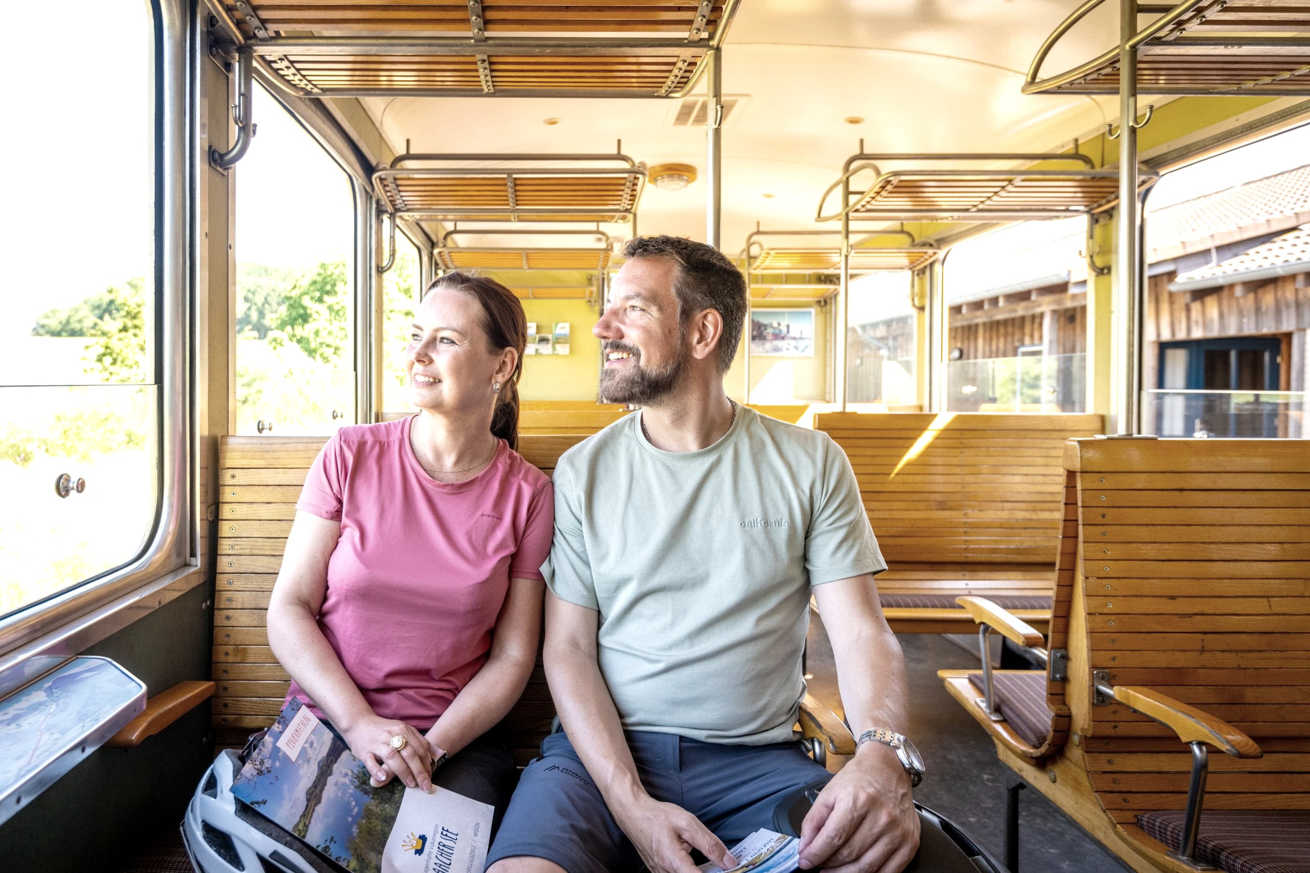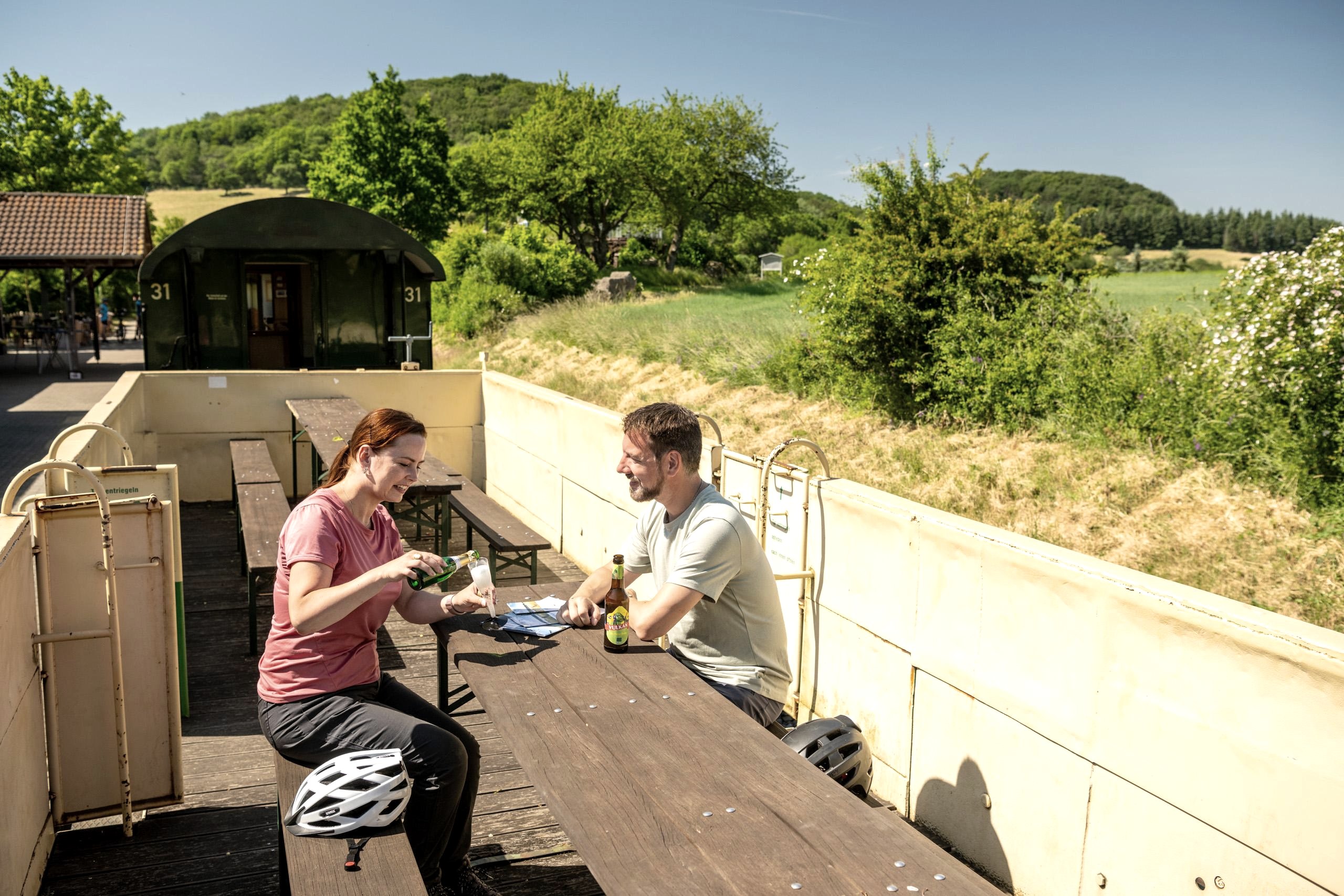 Der "Vulkan-Express Classic", bestehend aus einer historischen Diesellok, dem originalen Brohltalbahnwagen VB 50 und dem offenen Sommerwagen 458 bringt Sie ab 18:15 Uhr vom Bahnhof Brohl BE auf einer stilvollen Abendfahrt in die Eifel.
