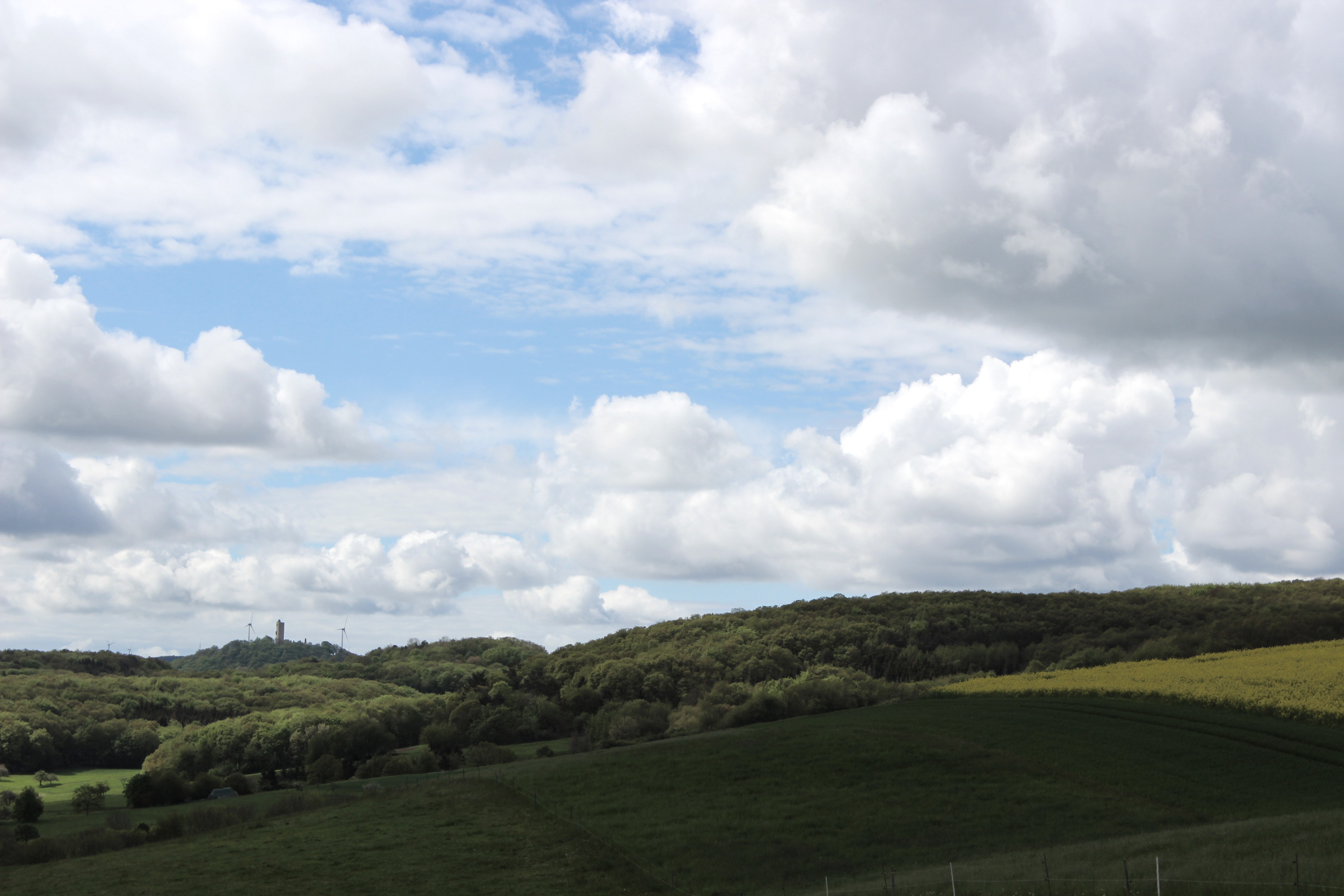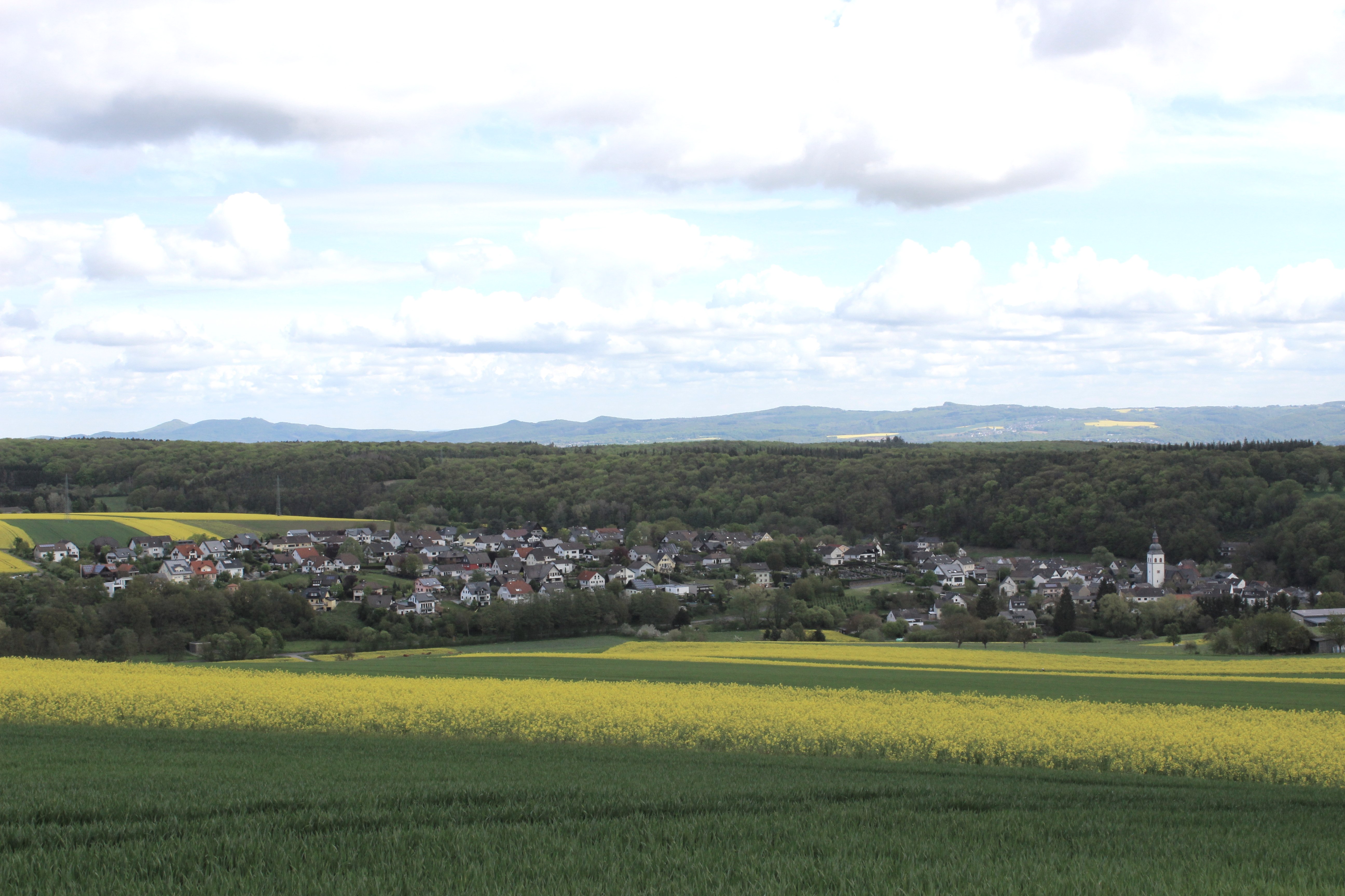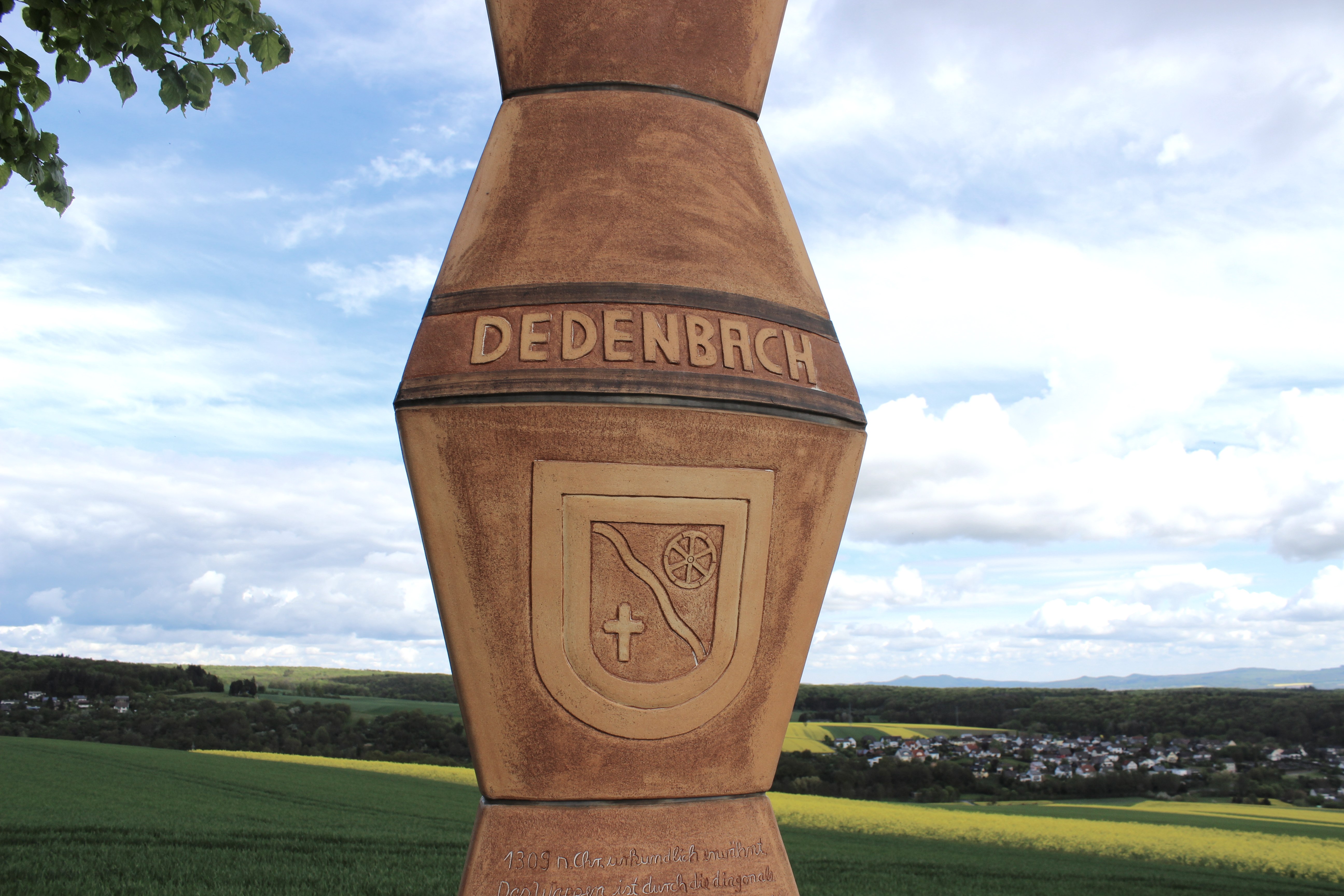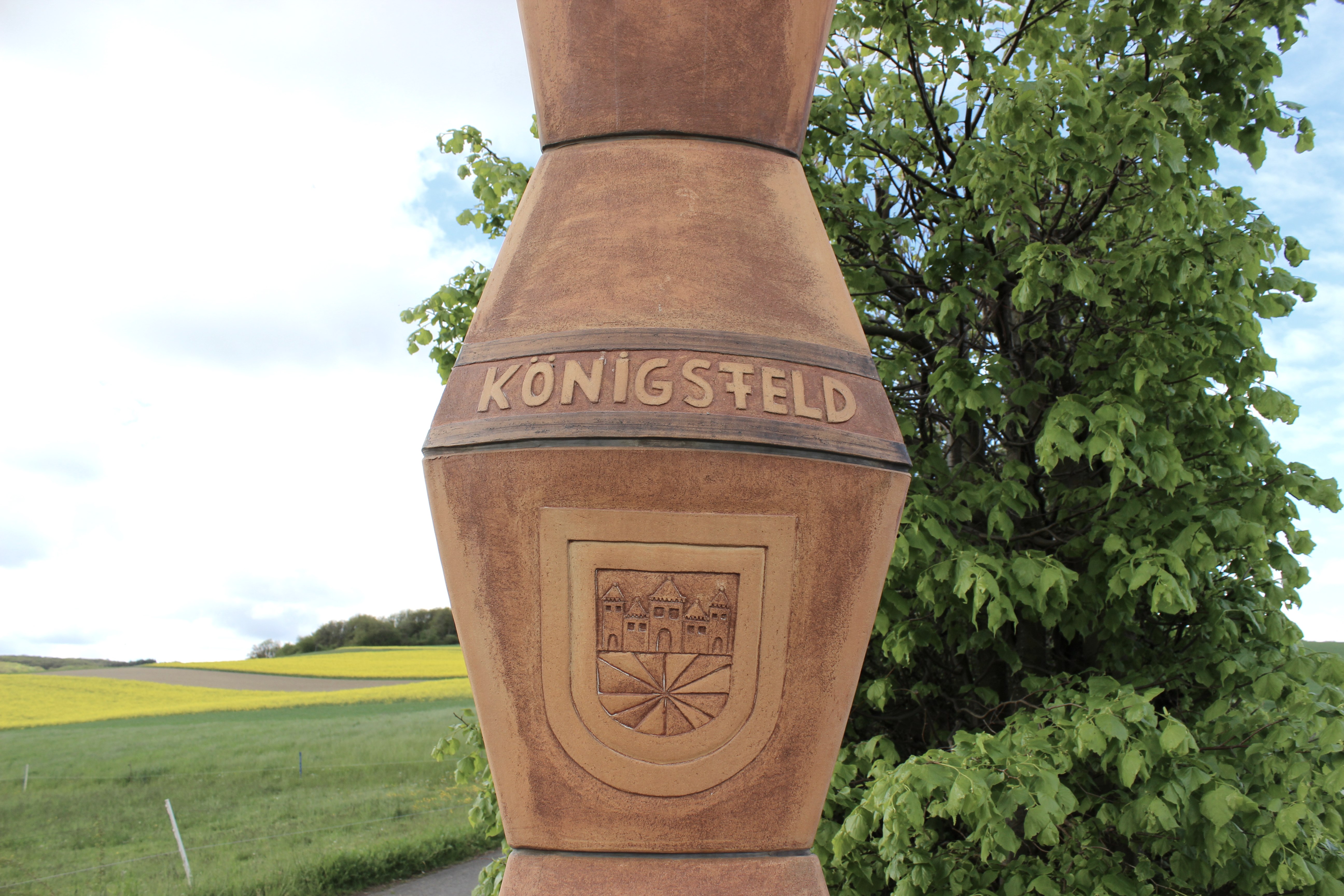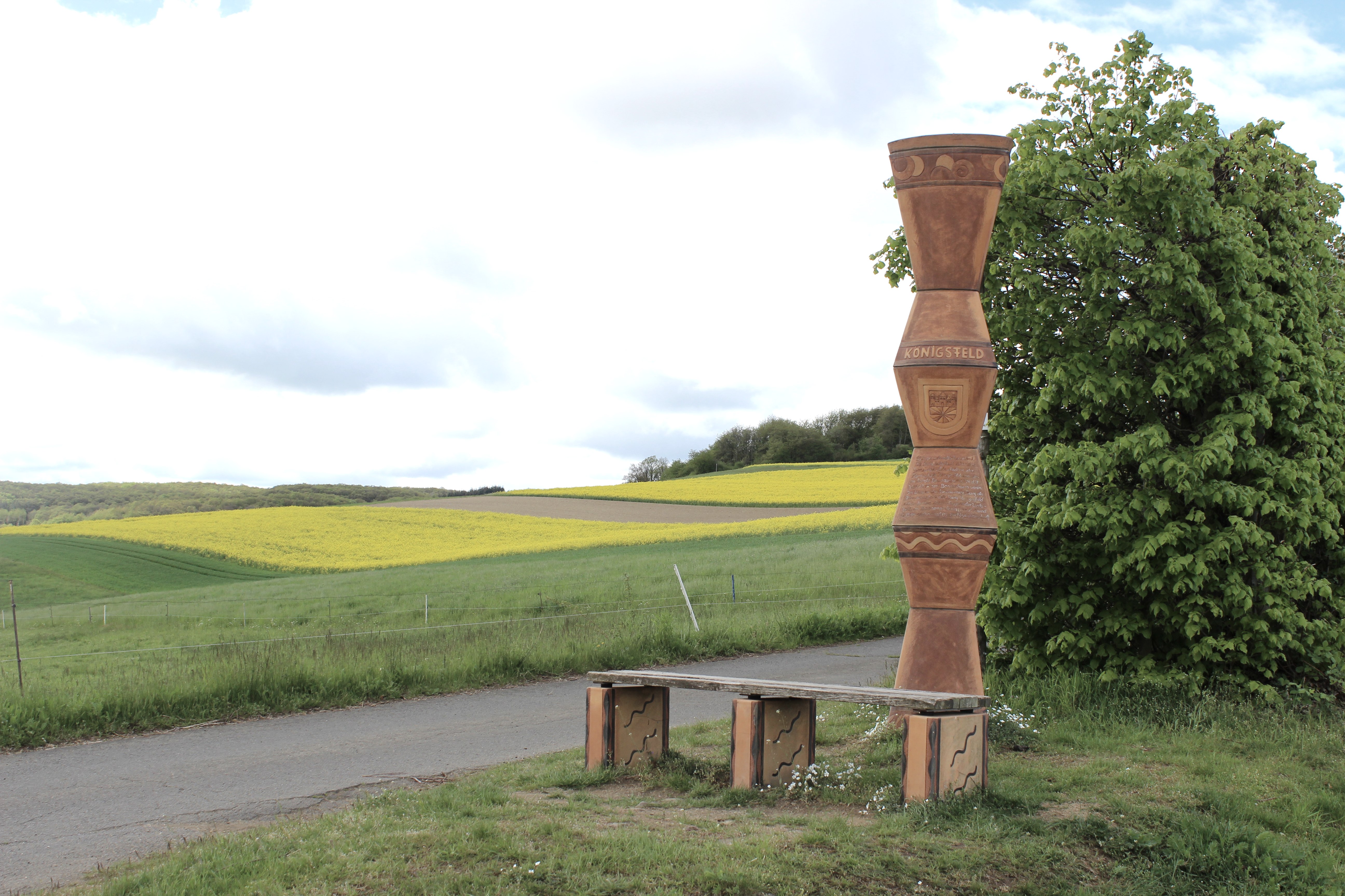 The cross and ceramic route starts at the community center in Königsfeld. The path leads left up Sinziger Straße to the Maternus Chapel and back to the L86. Shortly after the bus stop, follow a path over the Vinxtbach stream and you will reach a cattle trough. The path now leads off to the left to the so-called "Russenkreuz". From here, the path goes uphill to the right until it reaches a crossroads. To the right, the path leads over the farm track, where there is a wayside shrine with a ceramic bench. From here you have to walk back about 10 meters, then a path on the right leads to the entrance of the basalt quarry after a short distance. Hidden away and only accessible via a narrow flight of steps, you reach the Tafelrunde, a place to linger. If you leave the quarry and follow the path to the right, past the community column, you will reach the Dedenbacher hut "Schau ins Land". Above the hut, turn right and then take the second path to the right downhill to the Drei Wachen. Further downhill you reach the seating circle under the oak trees. Pass the Eifel gold bushes and continue past the watering hole back to the L 83. Following the sign of the Georoute, you walk into the new development area, via the cemetery back to the starting point.