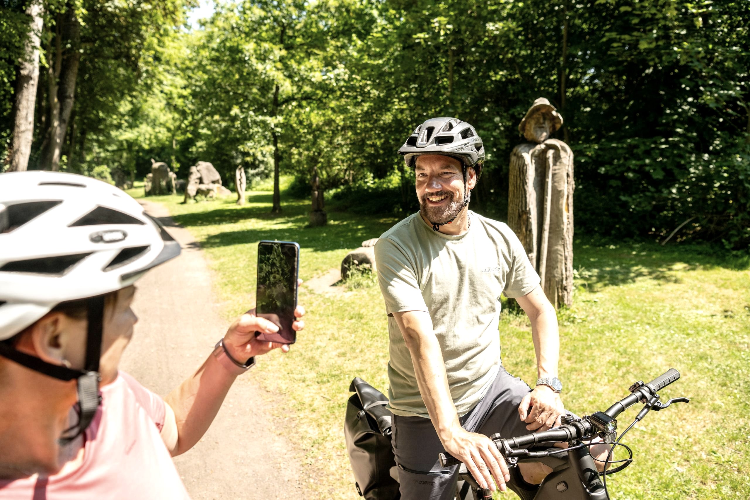In the middle of the Nettepark, the Kunstforum association created a sculpture park at the 2015 "Art in the Park Event". This "open-air workshop" was initiated by Christoph-Klaus Zernia (Plaidt) and Wolfgang Dillenkofer (Mayen). Other artists who participated in the action are Simone Carola Levy (Höhr-Grenzhausen) and Jürgen Beckamp (Niederkassel). Numerous impressive works of art made of wood as well as Plaidter Basalt were created. Simone Carola Levy, for example, created a two-part, rotating sculpture made of wood. The stonemason Christoph-Klaus Zernia carved a large head out of a basalt stone. And inspired by an earlier visit to Plaidter Park, Jürgen Beckamp modelled two playing children out of wood. A two-metre-long wooden structure by Wolfgang Dillenkofer and many other works of art complete the exhibition. In 2017, even more pieces were added, such as the motorbike on a basalt finial. Translated with www.DeepL.com/Translator (free version)