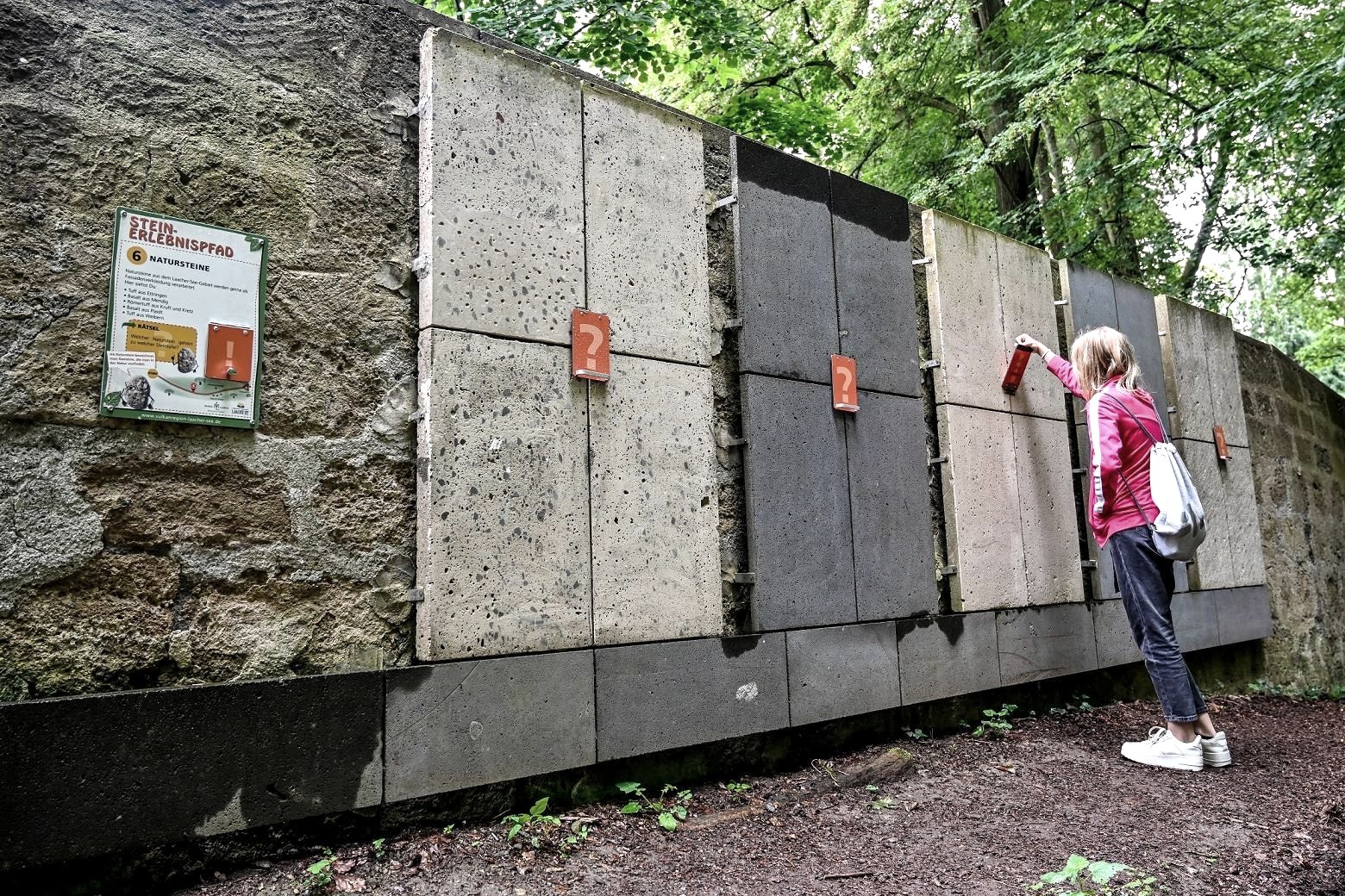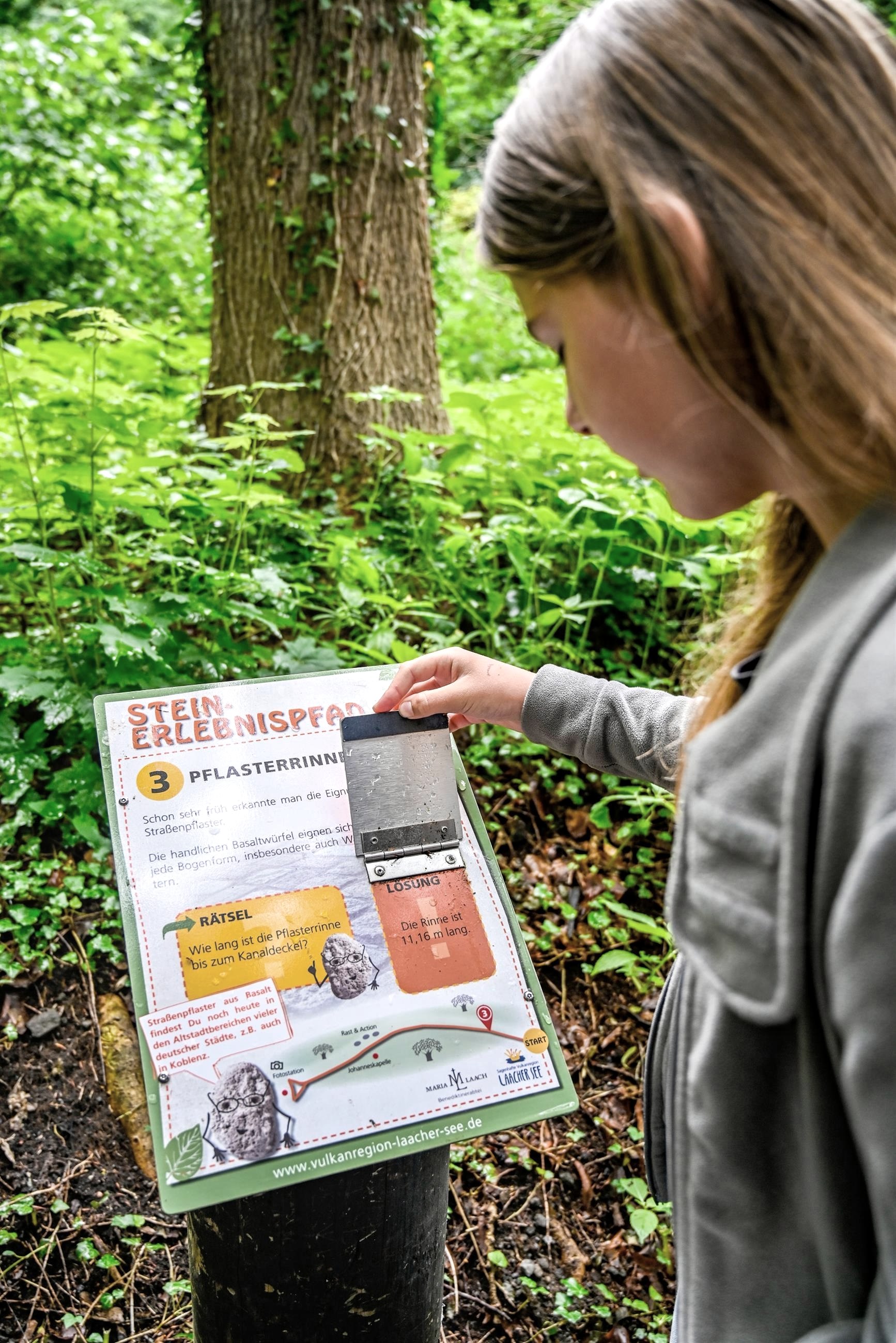 The mascot of the Laacher See volcanic region "Laachus", the floating pumice stone, accompanies the children along the 300 m long stone adventure trail on the monastery wall of Maria Laach and introduces them to volcanism with puzzles and child-friendly tables.