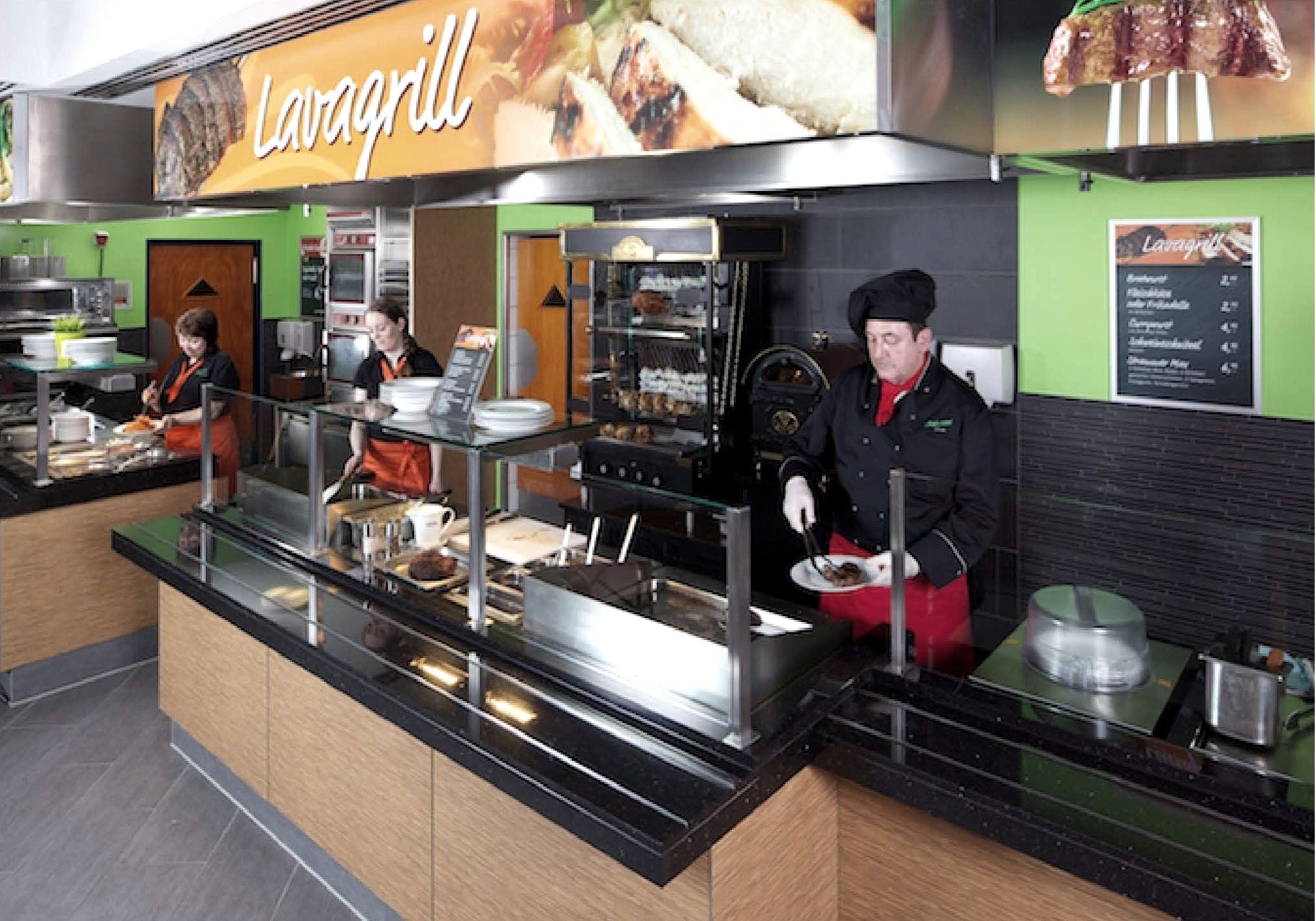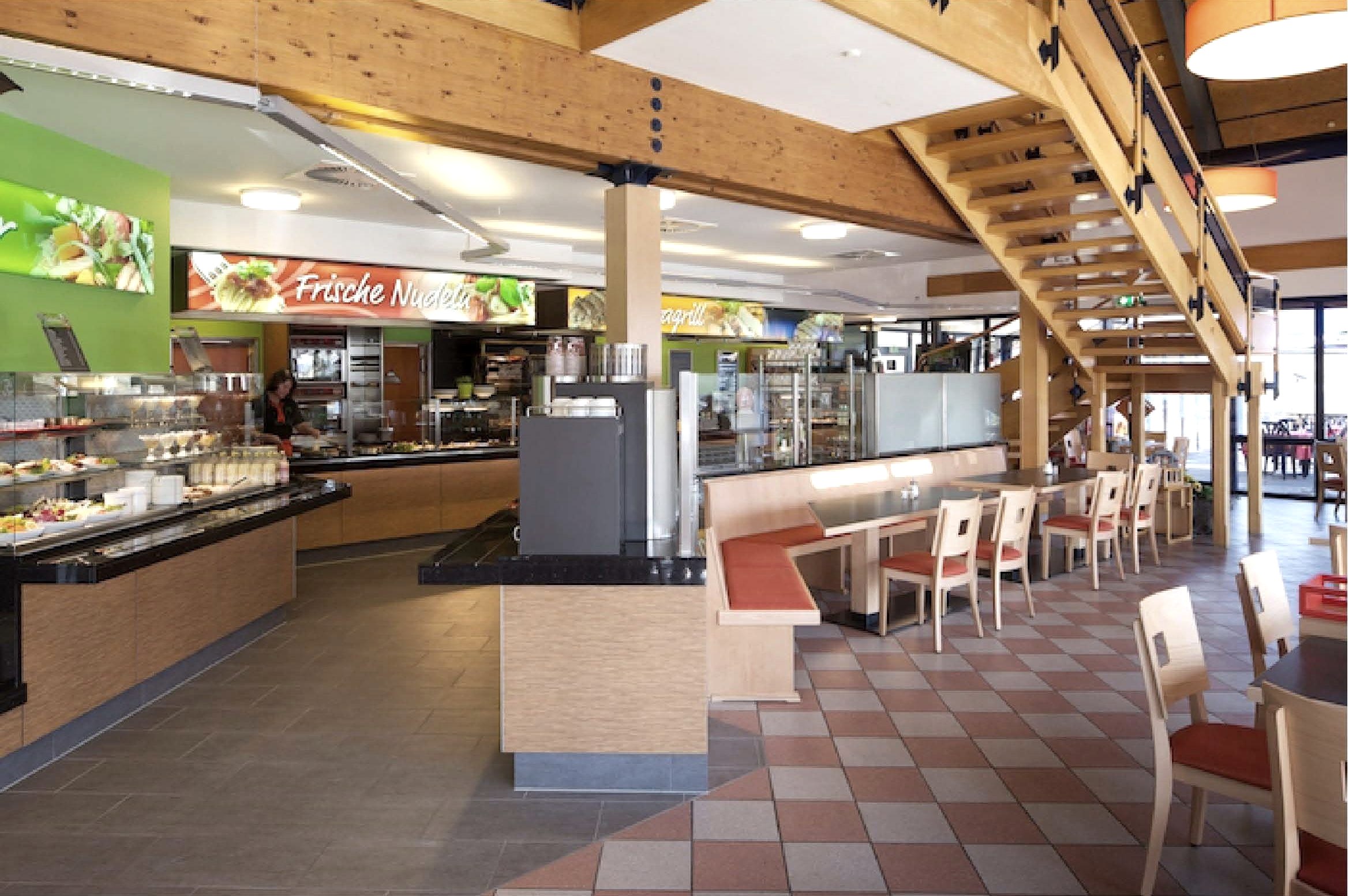 Nos salles climatisées, dotées d'une terrasse extérieure ensoleillée et d'un espace fumeur séparé, offrent une atmosphère détendue dans une architecture moderne. Avec plus de 100 places et un espace self-service parfaitement planifié, le restaurant propose des plats de pâtes et de viande fraîchement préparés au barbecue à la flamme ainsi que des salades croquantes et un vaste buffet de petit-déjeuner.