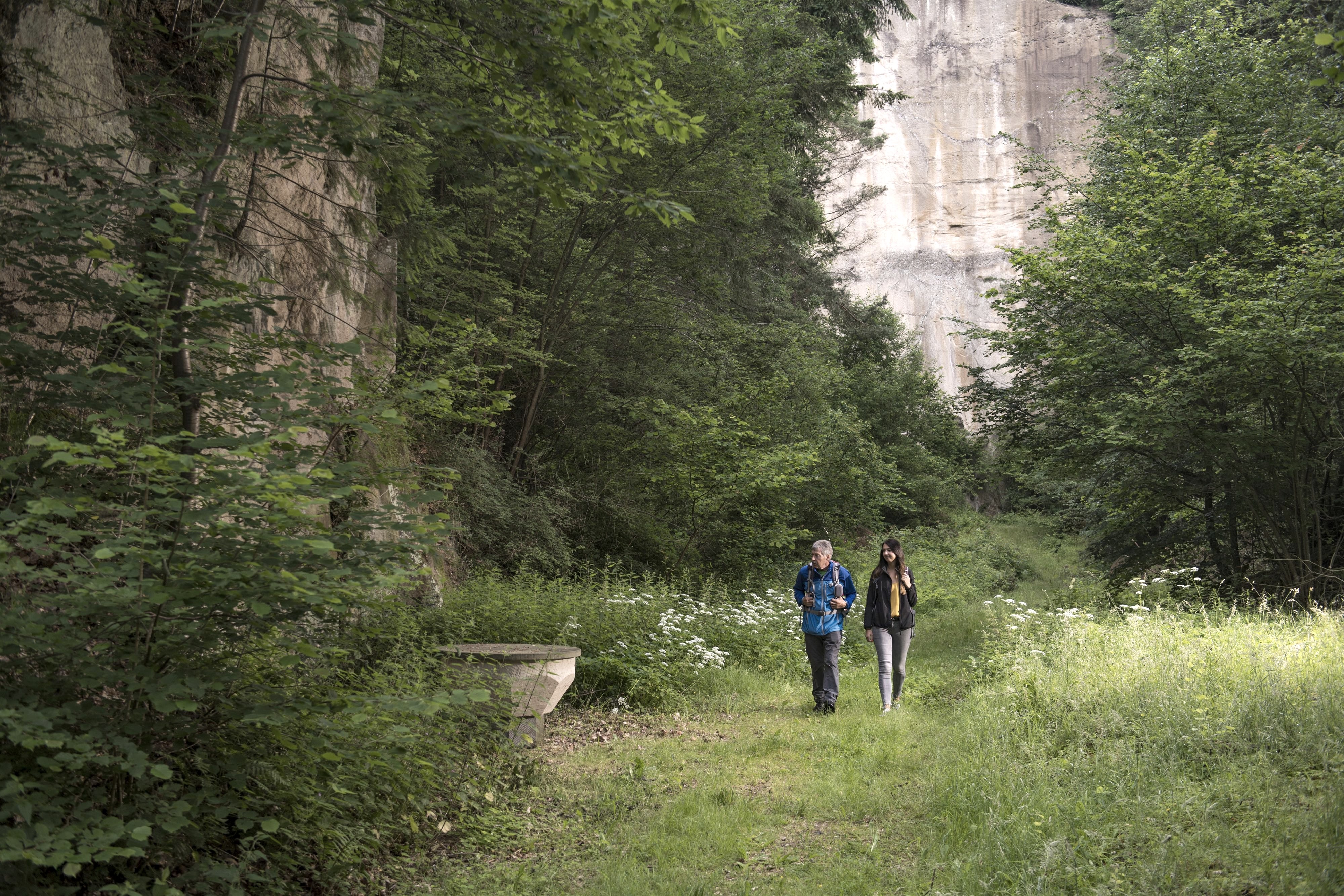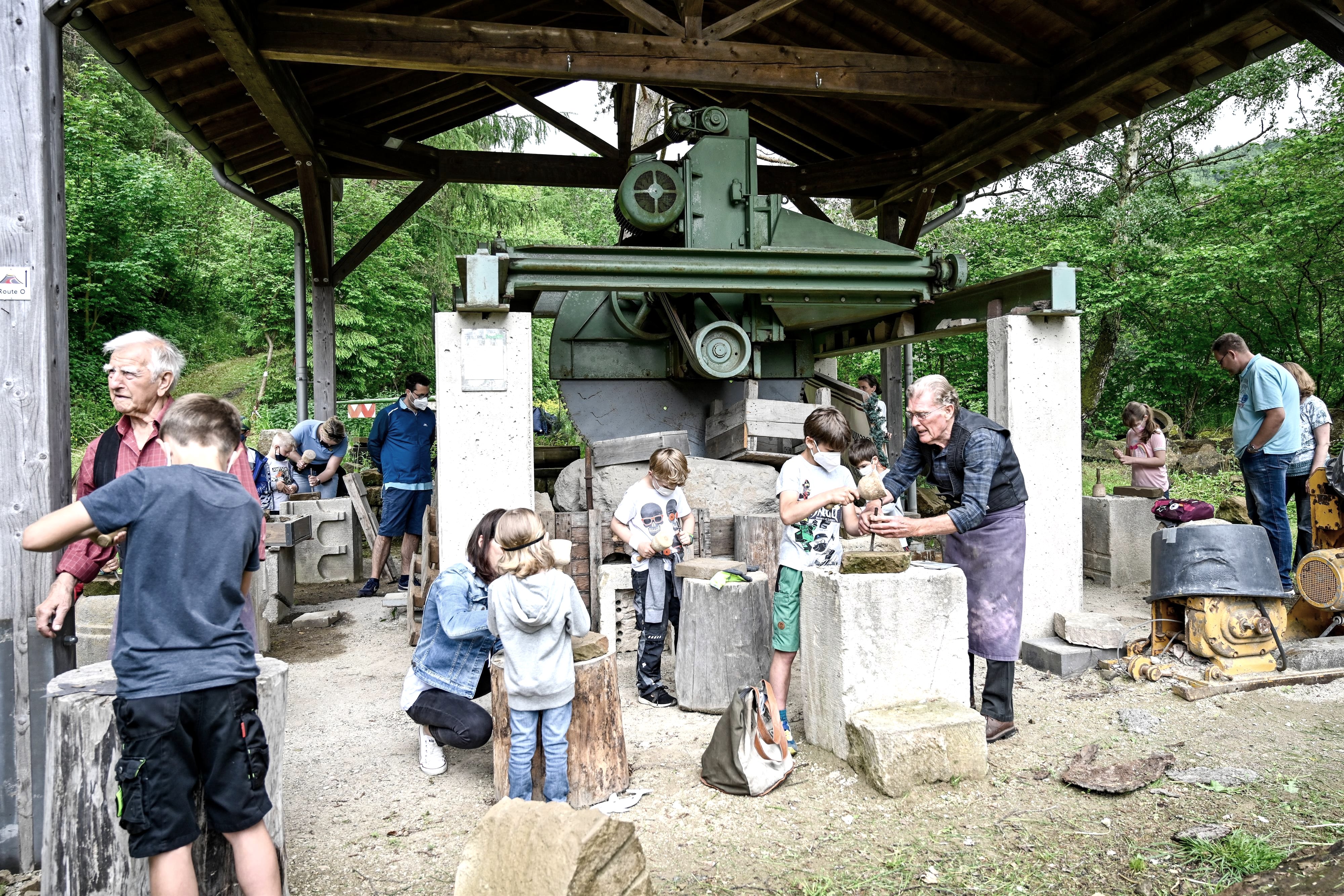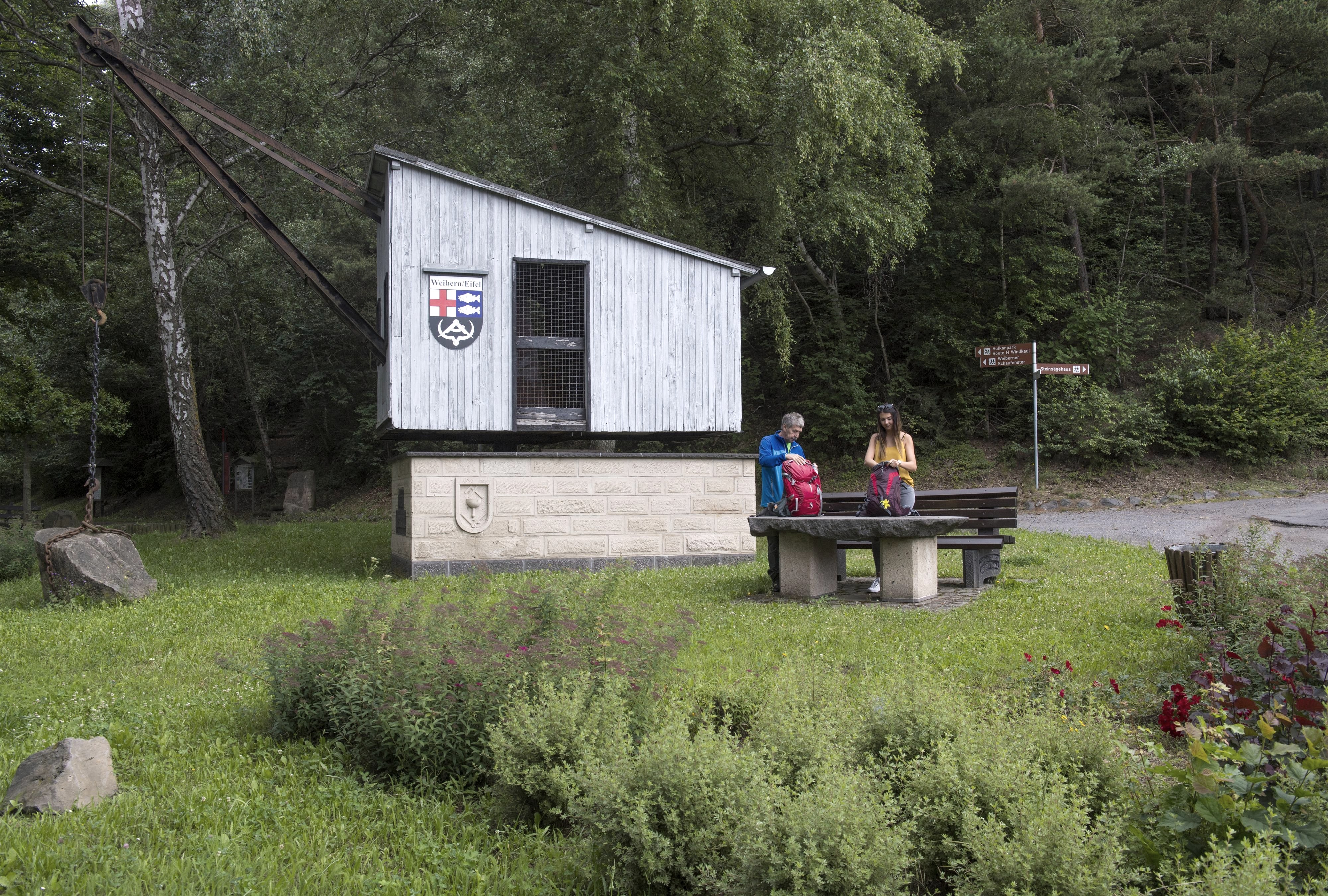 Si vous souhaitez en savoir plus sur le tuf, vous pouvez vous rendre à la "vitrine de Weibern" située à gauche et vous informer sur cette roche et ses possibilités d'utilisation. Le chemin qui monte à droite vous mène en quelques minutes à l'exposition en plein air de la Steinsägehaus, où une scie à pierre et une grue, entre autres, illustrent clairement les processus de travail autour de la pierre de taille qu'est le tuf.