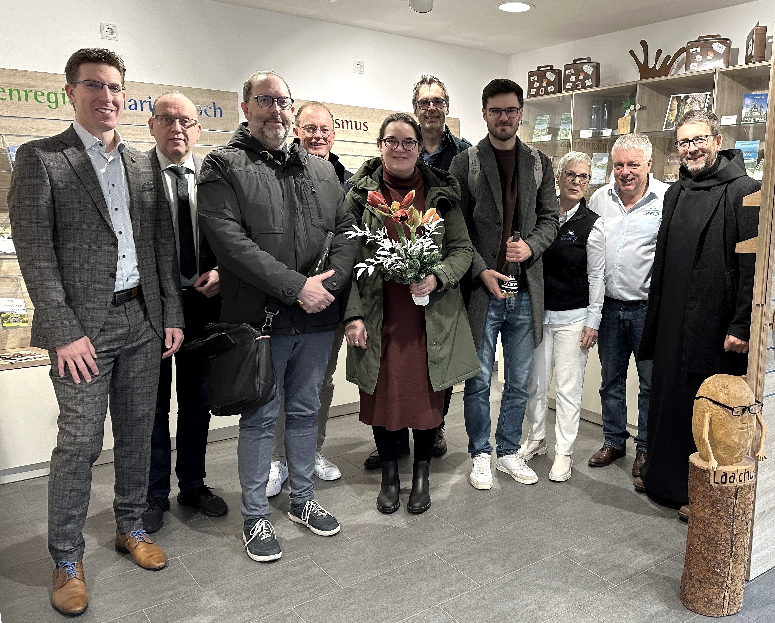 Für die Luxemburger Claude Kraft und Caroline Schroeder sowie den Belgier Eric Godard und den Trierer Thomas Schütz war es nicht der erste Besuch in Maria Laach, denn für die Mitarbeiter eines Stromnetzbetreibers ist Laach ein zentral gelegener Tagungsort. Vieles der "Sagenhaften Vulkanregion Laacher See" kannten sie aber noch nicht. Doch das soll sich jetzt ändern, denn das Quartett aus der Großregion Trier-Luxemburg-Belgien wurde bei einer Stippvisite in der TI nicht nur als Jubiläumsgäste im Jubiläumsjahr „10 Jahre TI Maria Laach“ empfangen, sondern auch über potentielle Reiseziele in der "Sagenhaften Vulkanregion Laacher See" informiert. Zudem gab es noch kleine Geschenke.