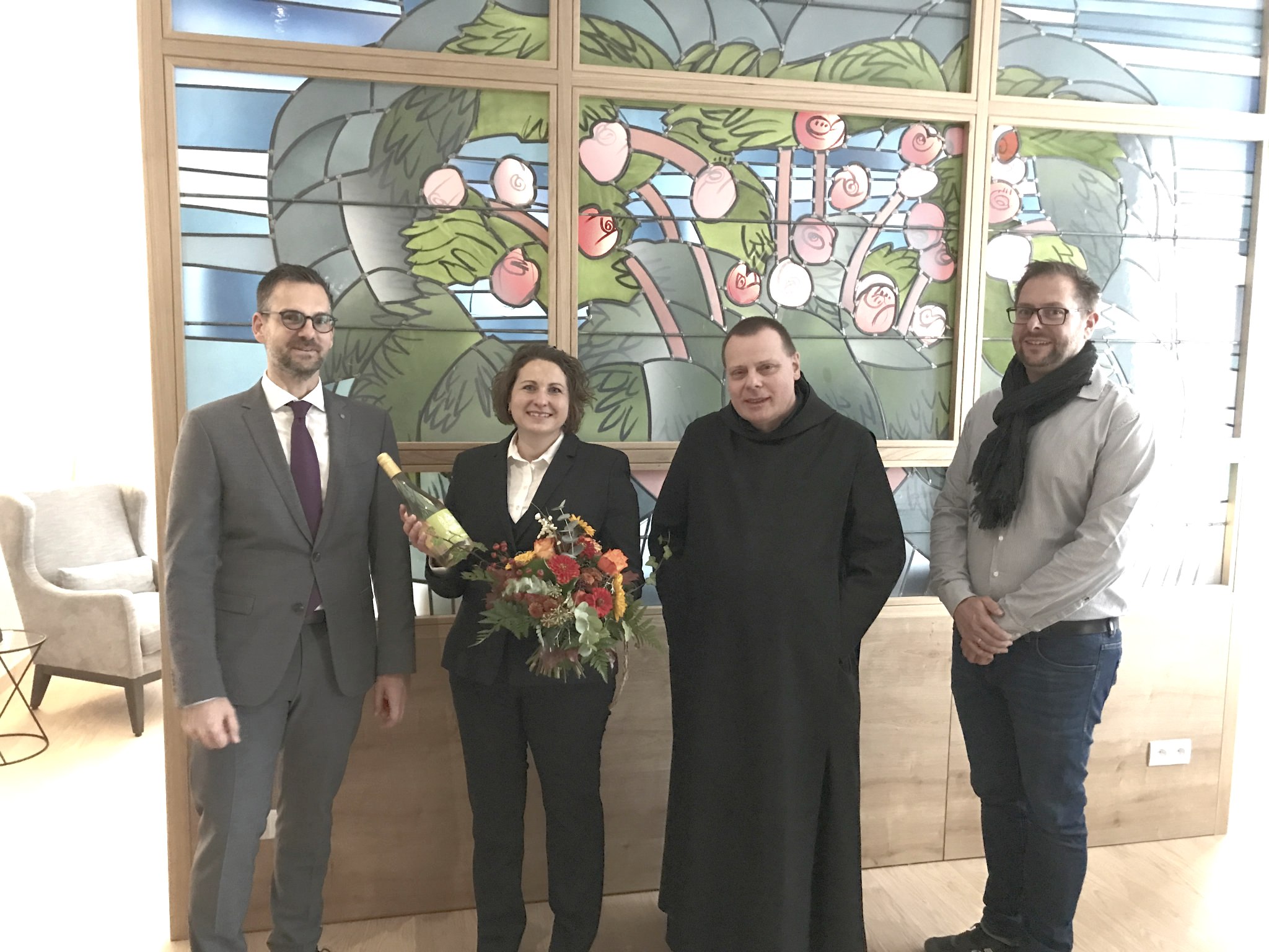 Dr. Pater Albert Sieger OSB (Mitte rechts), der Prior-Administrator Pater Petrus Nowack OSB vertrat, dankte im Namen des Konvents allen beteiligten Mitarbeitern, Partnern und helfenden Händen, die es möglich gemacht haben, in der Corona-Situation eine solche Aufgabe in dieser Zeit umzusetzen. Pater Albert Sieger OSB wünschte Frau Direktorin Wingold sowie allen Mit-arbeitern alles Gute. Geschäftsführer Philipp Lohse (links) dankte den Fries Architekten für den Mut, ein solches Wagnis einzugehen und die Herausfor-derung angenommen zu haben. Philipp Lohse betonte die kurzen Entscheidungswege und die zeitnahe Kommunikation zwischen Konvent und Archi-tekten.