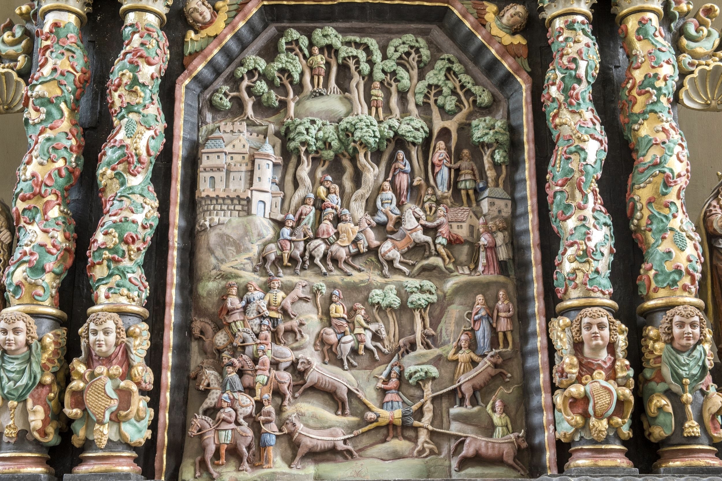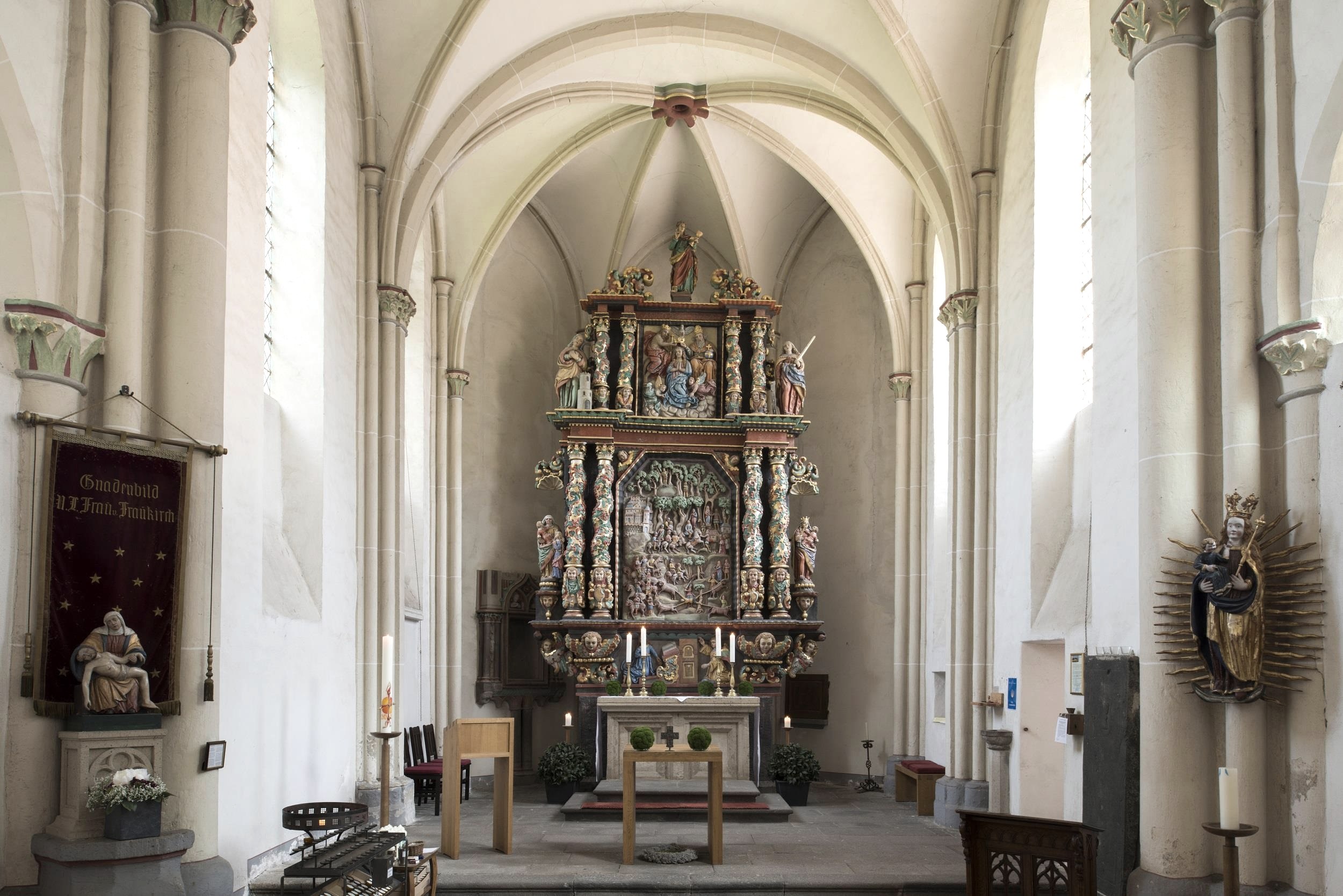 Ook bezienswaardig is het hoogaltaar met de 13e-eeuwse altaartafel, waarboven het tufstenen middenstuk uit 1664 oprijst. Naast de Annunciatie van Maria zijn hier ook scènes uit de Genoveva-legende afgebeeld.