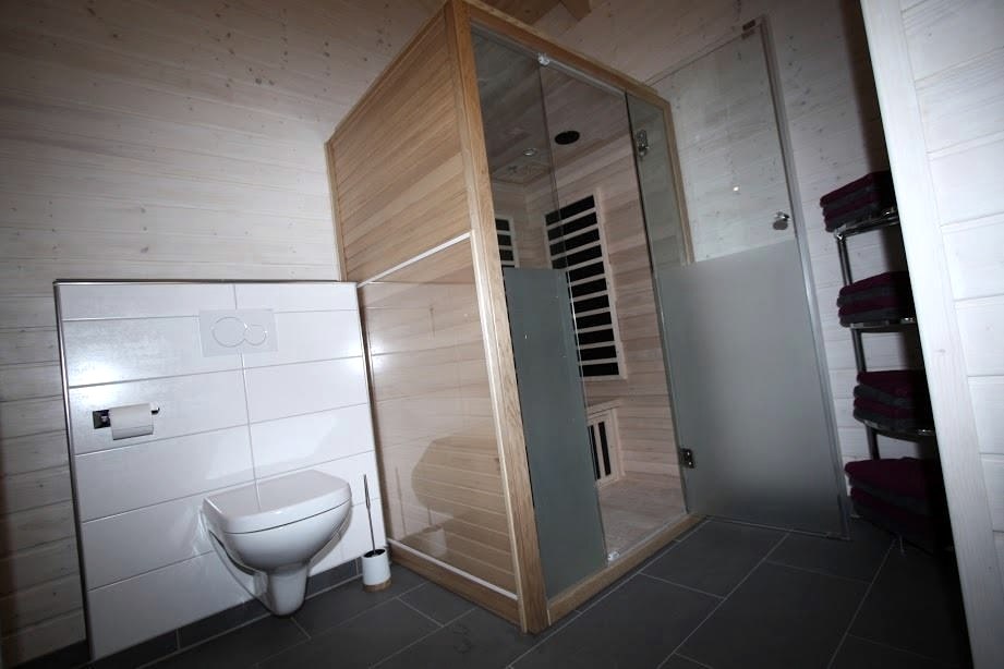 Die im Bad befindliche Wärmekabine verfügt über die Möglicheit mit Hilfe der verschiedenen Lampen eine entsprechende Lichttherapie zu nutzen.
